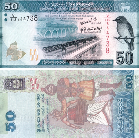 Аверс: Мост в Манампитии. Ранее использовавшийся мост, по которому ходили поезда и другие виды транспорта, изображён слева от нового моста. Над обоими мостами виднеется слабое изображение исторического арочного железнодорожного моста. Птица на правой стороне банкноты – шри-ланкийская голубая мухоловка (Eumyias sordida). Бабочка слева – голубая дуболистная каллима (Kallima philarchus).