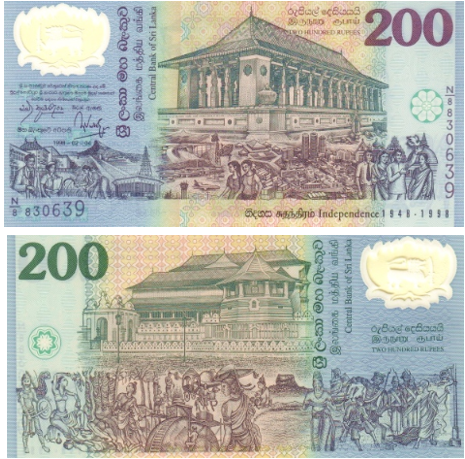 200 рупий (1998) — к 50-летию независимости (первая полимерная банкнота Шри-Ланки)