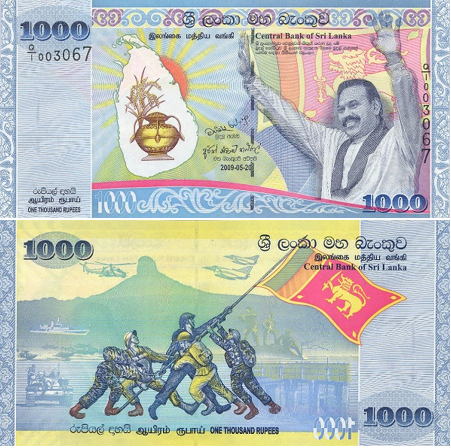 Реверс: Тема оборотной стороны банкноты – доблестный вклад победоносных сыновей и дочерей нации, сотрудников сил безопасности и полиции. В центре изображено поднятие национального флага сотрудниками сил безопасности. На заднем плане изображены скалы Мавил Ару и Топпигала (Шапка Барона), которые стали поворотными моментами в гуманитарных операциях сил безопасности