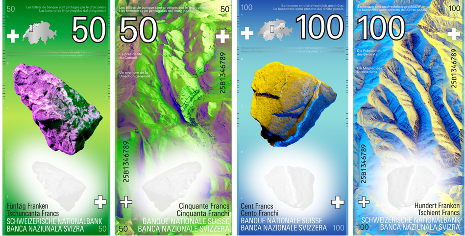 Каждая банкнота изображает породу, соответствующую определённой высоте от песчаников и известняков до гранита и кристаллов.