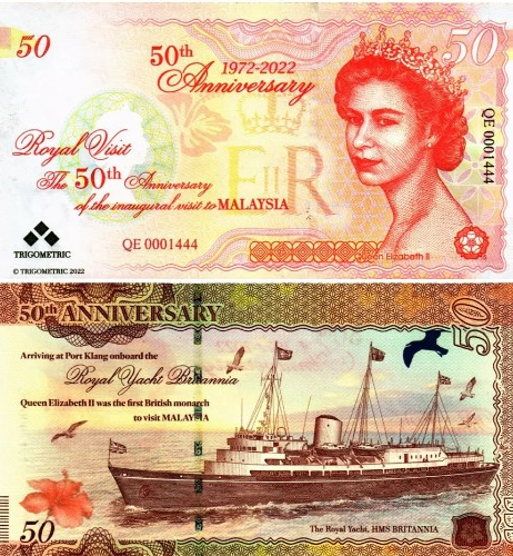 Тестовая банкнота Первый визит QE II в Малайзию, Королевская яхта, 1972-2022 посвящена 50-летию первого визита Королевы Елизаветы II в Малайзию (1972–2022) и выпущена ограниченным тиражом в 2000 экземпляров. Она поставляется в официальном буклете, что делает её ценным коллекционным предметом.Основные характеристики: