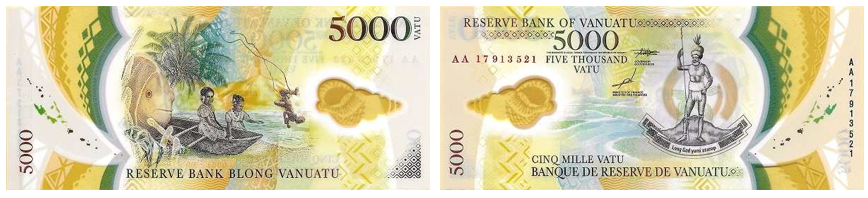 Новая серия банкнот Вануату включает 200, 500, 1000, 2000, 5.000 и 10.000 вату. Банкноты пластиковые, первые 2 цифры номера – это год выпуска. Кроме того, были выпущены памятные банкноты с надпечатками: 500 вату 2017 года (в честь Южно-Тихоокеанских мини-игр) и 1000 вату 2020 года (в честь 40-летия независимости).