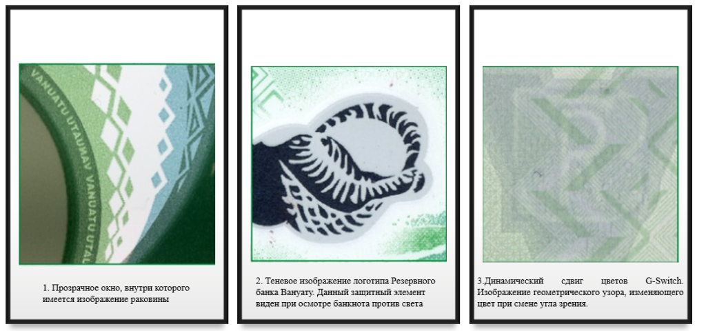 Современная валюта Вануату имеет совершенный вид и хорошие элементы защиты, она очень популярна в стране. Валюта не имеет практических аналогов. Прекрасно оформлена, в ней гармонично сочетаются оттенки и цвета делая её одной из самых красивых валют в мире.