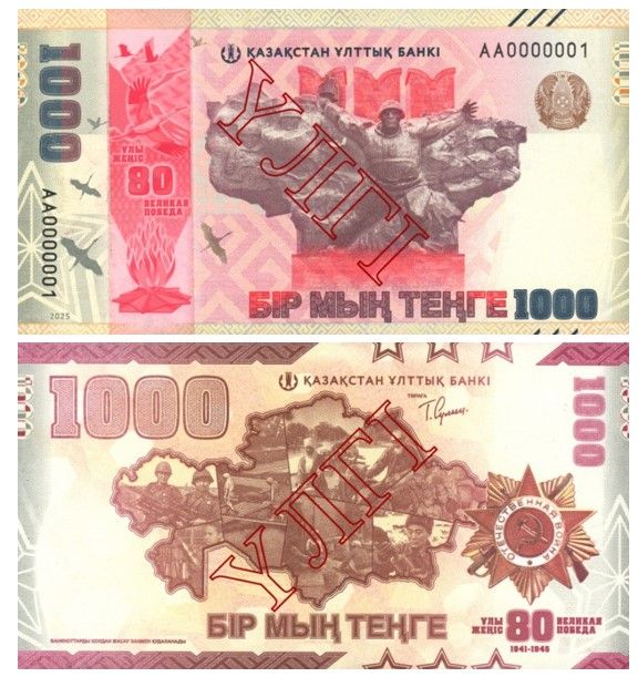 Национальный Банк Казахстана с 9 мая 2025 г. выпускает в обращение юбилейную банкноту номиналом 1000 тенге, посвященную 80-летию Великой Победы.Тираж банкноты ограничен и составит 5 млн экземпляров.