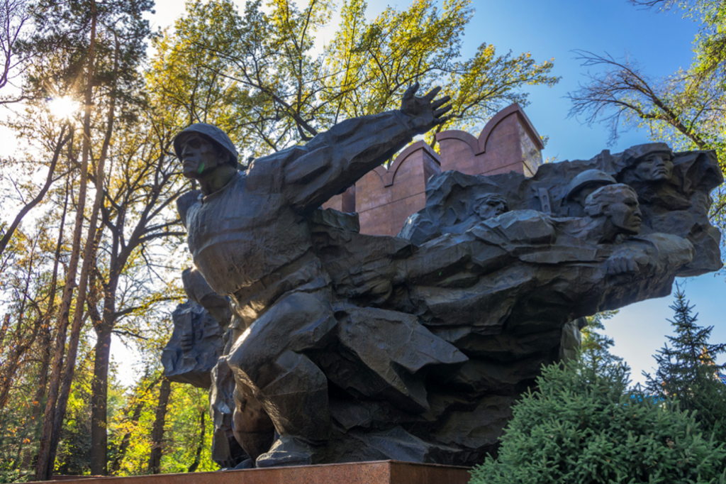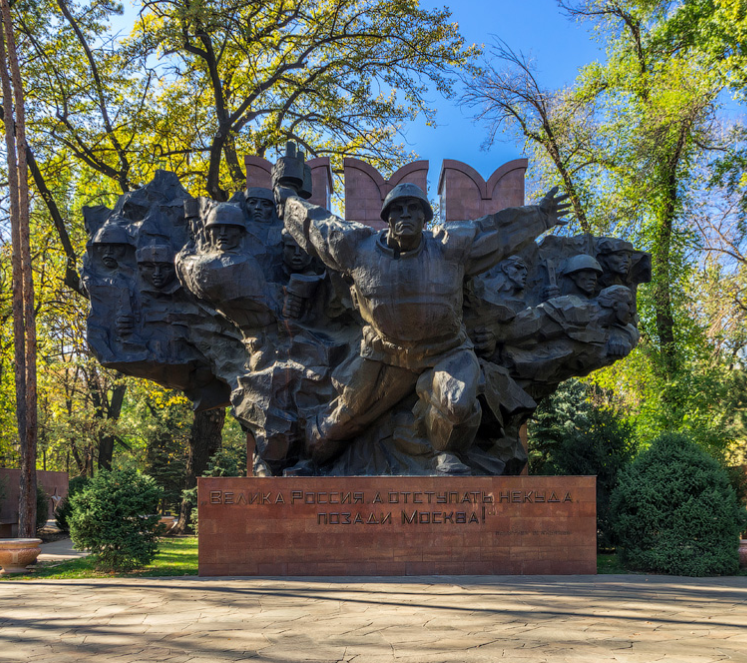 Лицевая сторона: На лицевой стороне памятной банкноты изображен мемориал славы, расположенный в парке имени 28 гвардейцев-панфиловцев — дань памяти героям, отдавших жизни за Родину. Сам парк получил свое нынешнее название в 1942 году. А Мемориал Славы в нем был сооружен значительно позже – через 33 года, в1975-м. Над композицией работала группа архитекторов и скульпторов под руководством известного архитектора Толеу Басенова. В 1975 году алматинцы впервые отмечали День Победы рядом с Мемориалом Славы. Это окрыляло людей, веривших в то, что войны больше никогда не будет. Микрооптическая защитная полоса. При изменении угла обзора банкноты: на полосе становятся видны трехмерный эффект глубины, объема и сияния, а также эффект движения вечного огня и летящих журавлей. Силуэты журавлей олицетворяют добро и надежду, символизируют жизнь.