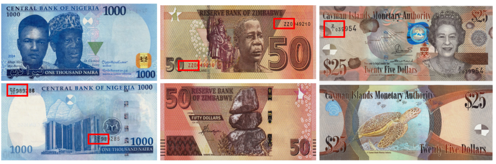 | Замбия | Префикс "X3" для полимерных банкнот |